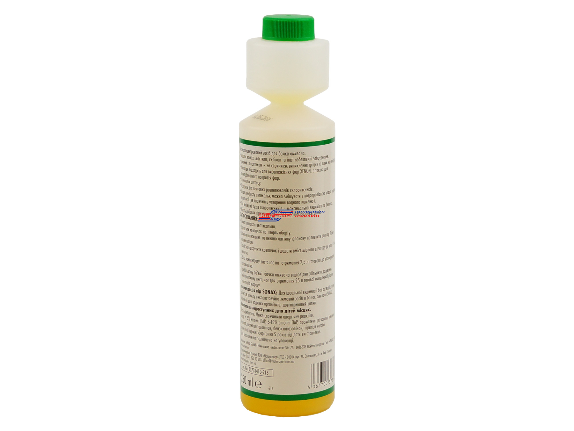 Концентрат омивача літній (яблуко) SONAX Clear View 1:100 Lemon Fresh 250 мл 373141. Висококонцентрований осінньо-весняно-літній концентрат омивача 250 мл дає змогу отримати рідину омивача скла об'ємом до 25 літрів, хоча чимало водіїв намагаються отримати більший об'єм рідини омивача, використовуючи концентрат омивача скла SONAX. Варто зазначити, що концентрати SONAX для стекол не містять шкідливих хімічних речовин і під час їхнього використання у вас не буде з'являтися неприємний отруйний запах у салоні автомобіля.