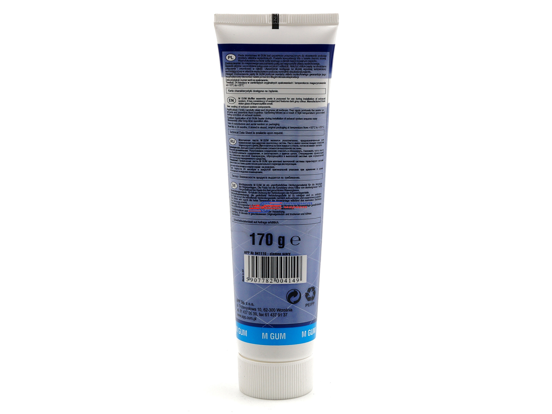 APP M-GUM – спеціально розроблена паста темно-сірого кольору на основі рідкого скла, що використовується при монтажі вихлопних систем. Цей засіб є ущільнювачем, що дозволяє зробити з'єднання більш герметичним. Без запаху.