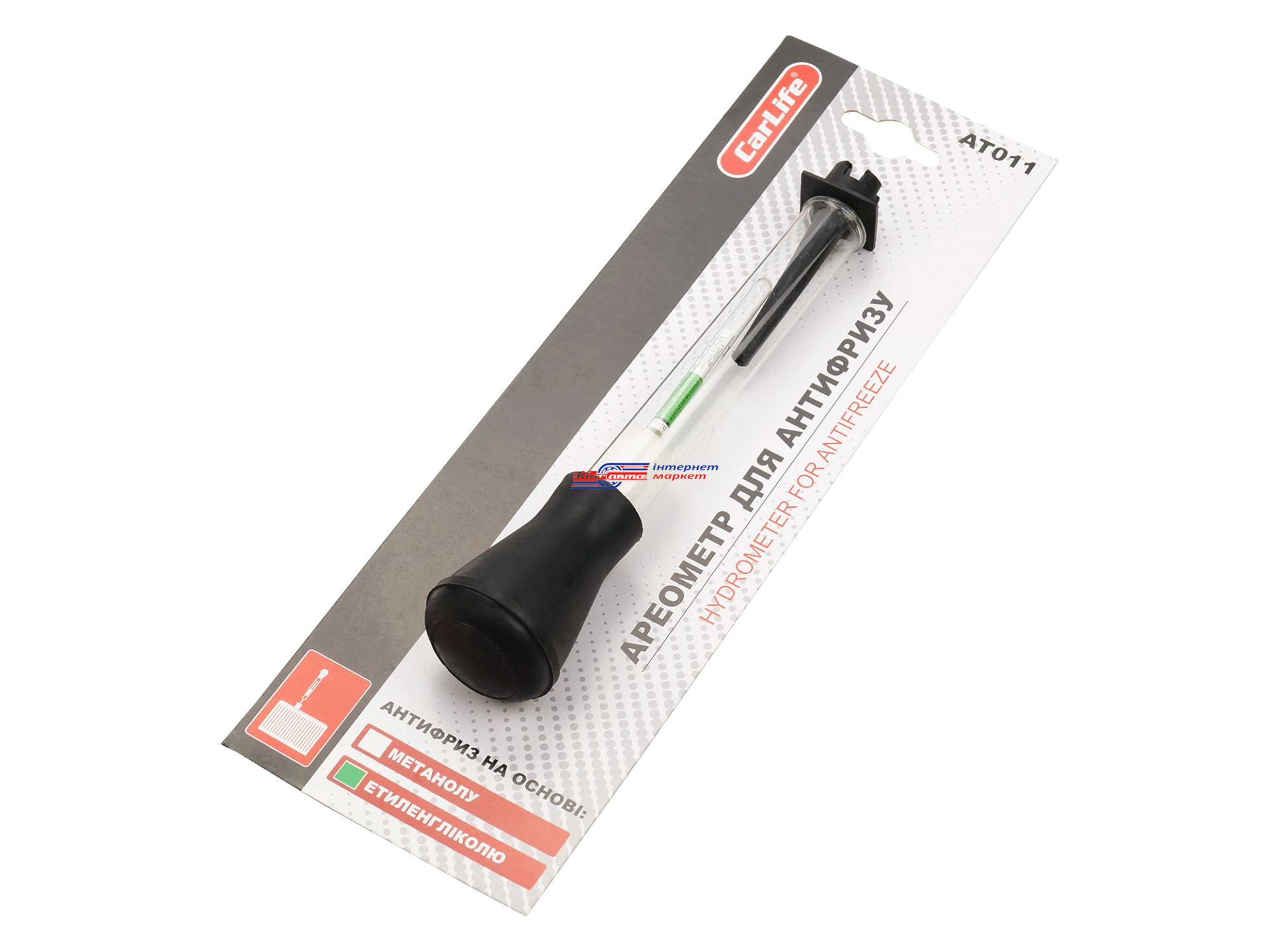 Ареометр CARLIFE AT-011 - велика скляна колба у формі циліндра з такими елементами: 1. З одного боку - довгаста гумова насадка для відбору рідини; 2. З іншого - гумова груша для відбору проби; 3. Поплавок у вигляді порожнистого стрижня круглого перетину зі шкалою. Градуювання шкали відображає показник густини рідини. 4. Для баласту всередині стрижень заповнений ртуттю або свинцем. Як користуватися ареометром CARLIFE AT-011: 1. відкрийте пробки заливних отворів акумулятора. Щільність електроліту заміряється в кожній окремій комірці. 2. Занурте носову насадку у видимий розчин. 3. натисніть грушу і відбираємо рідину. 4. Витягніть ареометр з акумулятора.