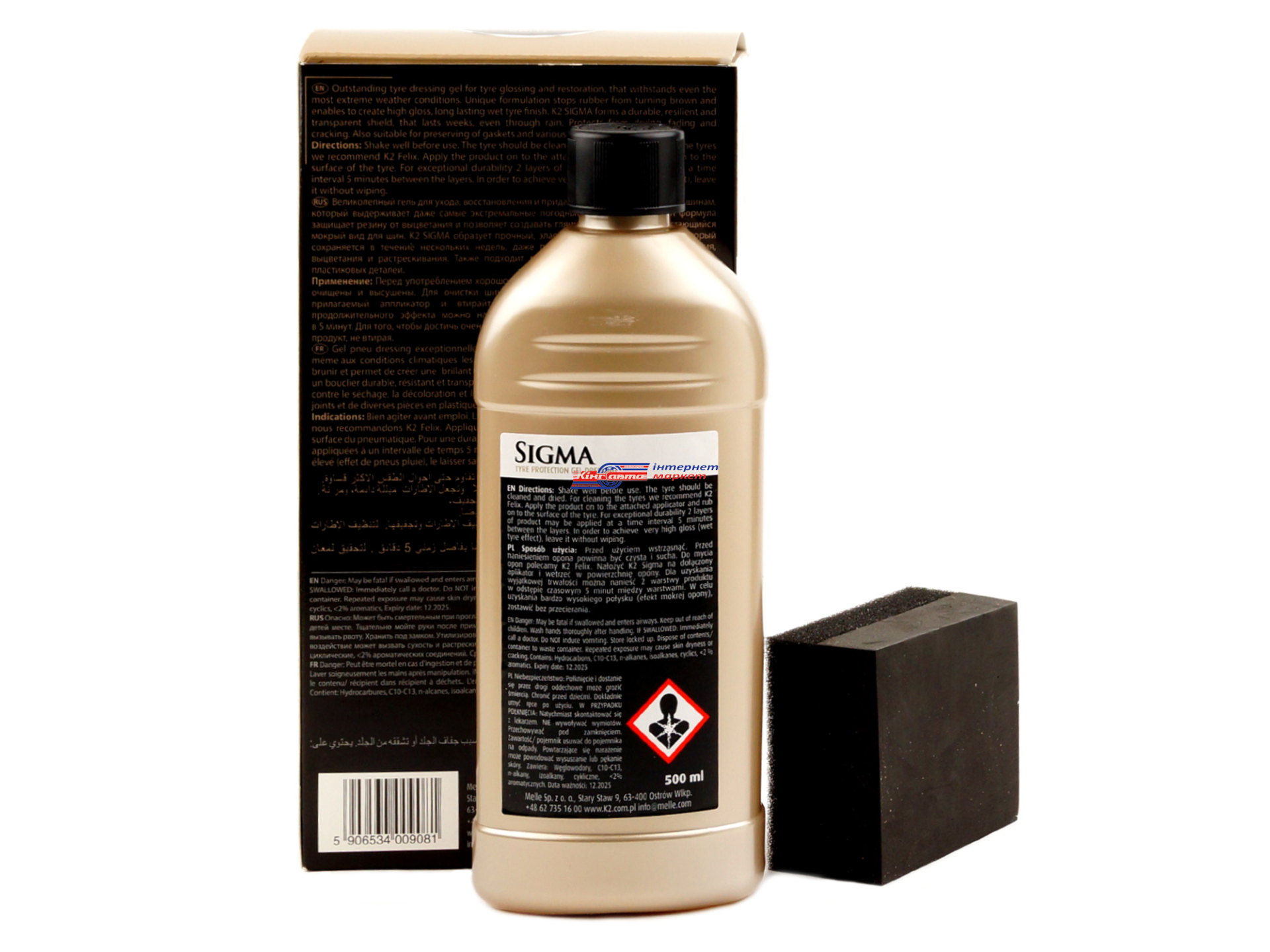 K2 Sigma G157 засіб по догляду за гумовими деталями - комплект із молочка-чорнителя гуми та пластику й аплікатора, призначений для догляду та захисту автомобільних покришок, молдингів, нефарбованих бамперів або колісних арок. Інноваційна формула забезпечує глибоке проникнення засобу в гумову поверхню, відновлюючи їх зовнішній вигляд і гарантуючи високу стійкість до зсихання і розтріскування. Оновлює вицвілі пластмасові поверхні, відновлюючи їхній заводський колір. K2 SIGMA G1571 500мл надійно захищає оброблені поверхні від зовнішніх негативних чинників довкілля, ультрафіолетового випромінювання і запобігає налипанню пилу.