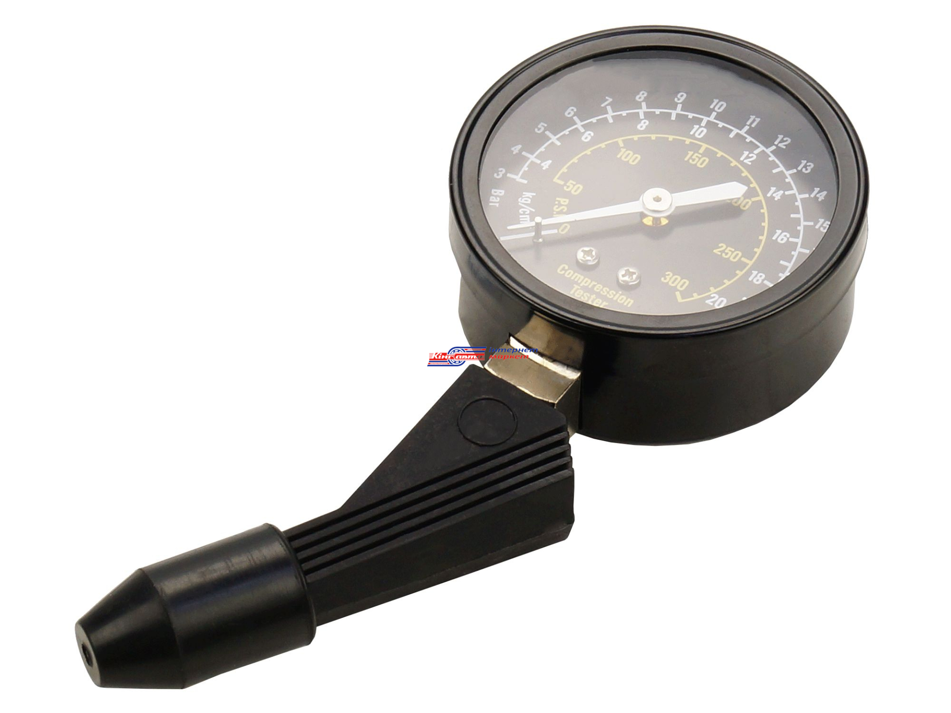 Дві шкали різного кольору: 0-300 psi, 21 кг/см² Повна шкала діаметром 2,5" (60мм) Універсальний конічний гумовий наконечник підходить до всіх отворів для свічок запалювання. Простий компрессометр натискного типу для виявлення зношених або пошкоджених кілець ущільнювачів, клапанів, поршнів і циліндрів. Тип компресометра: натискний.