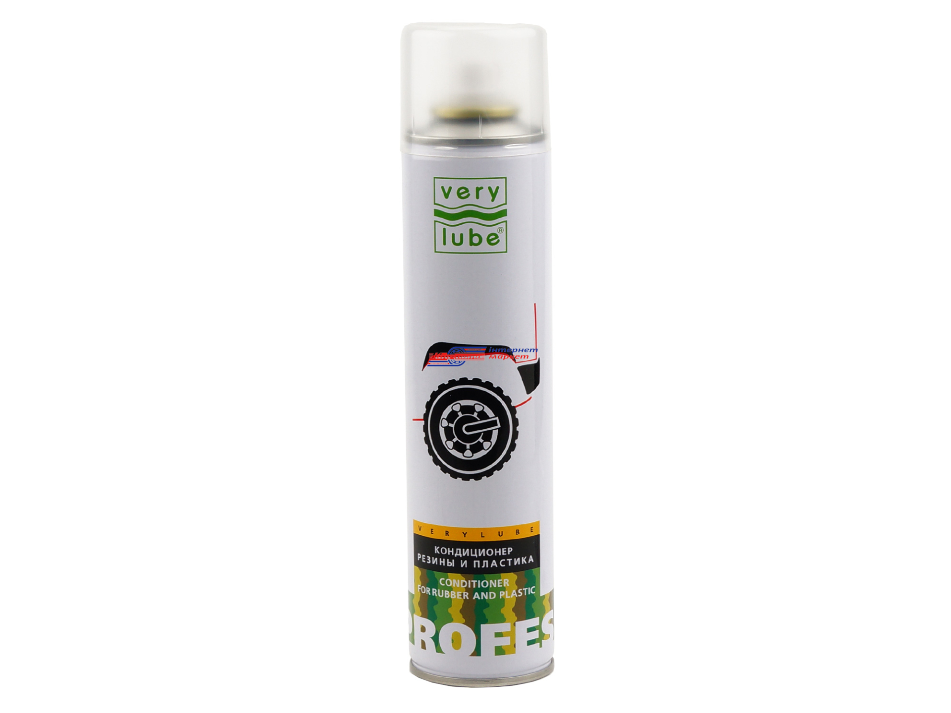 VERYLUBE Кондиціонер-спрей для догляду за виробами з гуми та пластмаси. Аерозольний балон 500мл. Засіб для відновлення оригінального кольору виробів з гуми та пластику. Застосовується для обробки покришок, бамперів, молдингів, корпусів дзеркал, торпедо та інших деталей автомобіля з гуми та пластику. Є ефективною альтернативою мийці підкапотного простору двигуна. Після застосування деталі виглядають новими, як зі складального конвеєра.