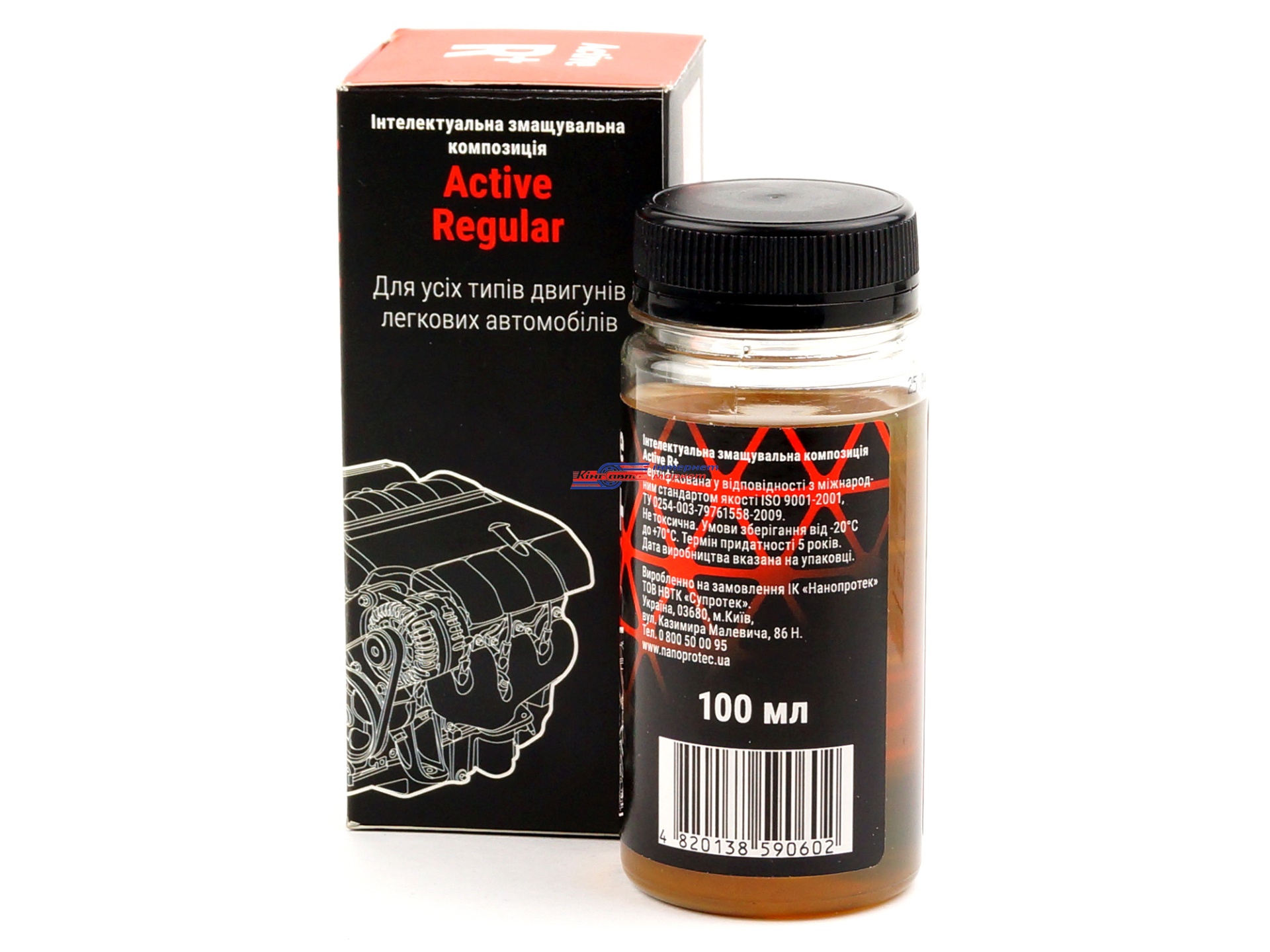 Інтелектуальна мастильна композиція Nanoprotec Active Регуляр призначена для підтримання робочих характеристик і захисту від зношування бензинових, дизельних і газових двигунів легкових автомобілів, попередньо оброблених іншими ІСК Nanoprotec Active.