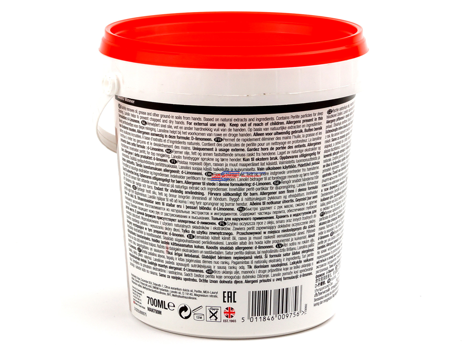 Властивості: - Зроблено з натуральних компонентів. - Абразивні частинки легко розчиняють бруд. - Легко видаляє олію, мастило і гудрон. - Містить зволожувач для запобігання пересиханню і розтріскуванню шкіри рук. - Схвалено Королівським Інститутом Громадського Здоров'я та Гігієни Великої Британії. - Не тестувалося на тваринах.