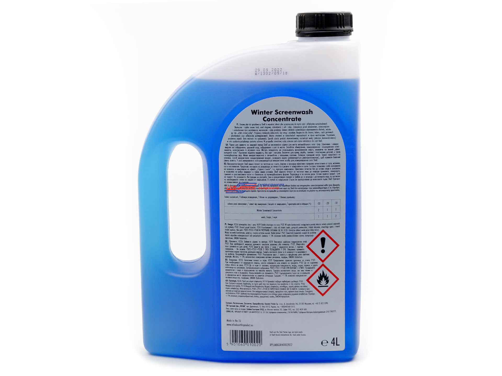 Виготовлена на основі спиртовмісних компонентів і поверхнево-активних речовин, які гарантують якісне та швидке усунення забруднень усіх видів, характерних для холодної пори року, наприклад, сльота, бруд, масляна плівка та багато інших. Засіб SHELL Winter Screenwash концентрат -55°C самостійно випаровується і не залишає плям, смуг або голограм, гарантуючи відмінну прозорість скла для безперешкодного огляду як у денний, так і нічний час доби.